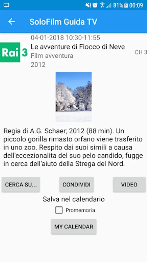 For each film you can view a summary and if you want, you can save a reminder in the calendar of the device.