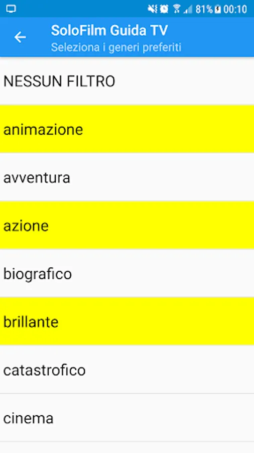 It is possible to filter the lists with the favorite genres and TV channels, to share the information of the films via SMS, email, social networks