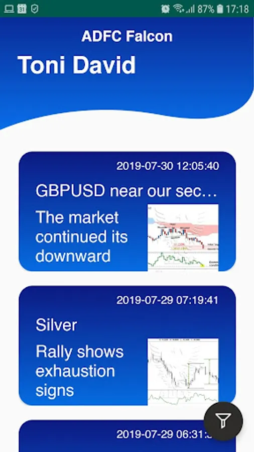 ADFC Falcon provides analysis on Futures and Forex markets. Analysis covers different products like currencies, metals, oil, stock indices etc. A notification will be received each time a new analysis is released . Analysis received will be ranked by date and time with click on headline will show details and charts . User can apply filter to see analysis by product. Multiple package are available where each package contains specific products and user can chose which package will be convenient for him.