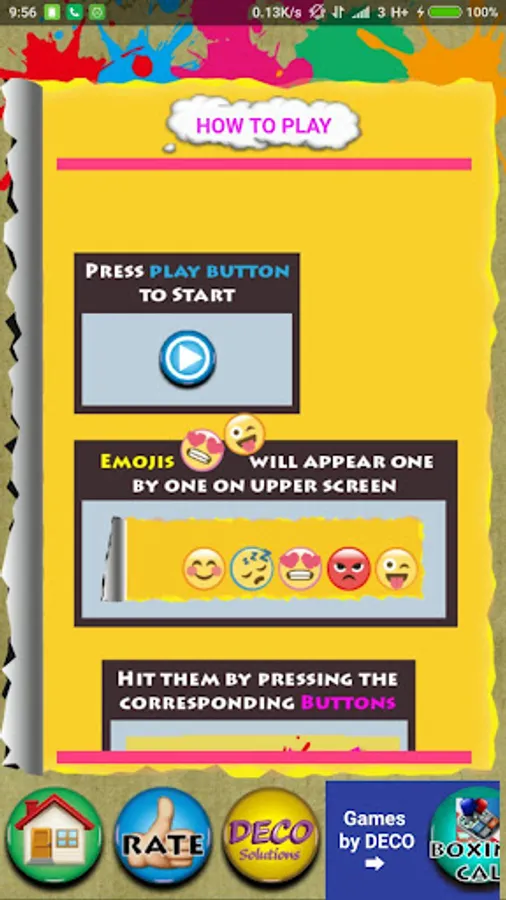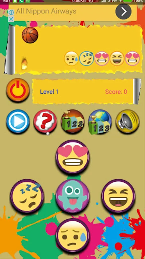 Press "Blue Play Button" to start the game. The Emoji will appear one by one on screen. There are 10 levels for Emoji Battle. As the level up, the speed and numbers of Emojis increase and the positions of emoji buttons change as well.
