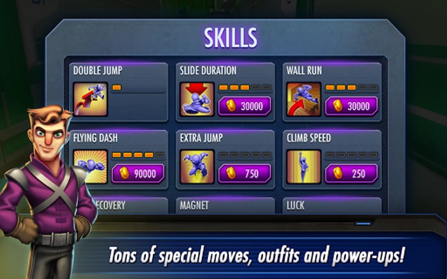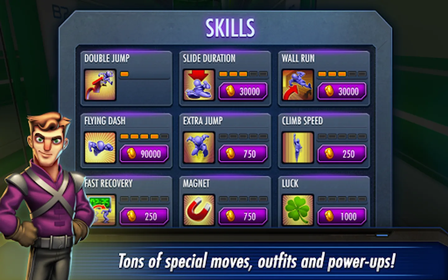 Jack can upgrade his skills to jump, slide, walk over the walls, make a flying dash and much more. Using these skills you will be able to go further each time in a train full of traps and deathly devices!
