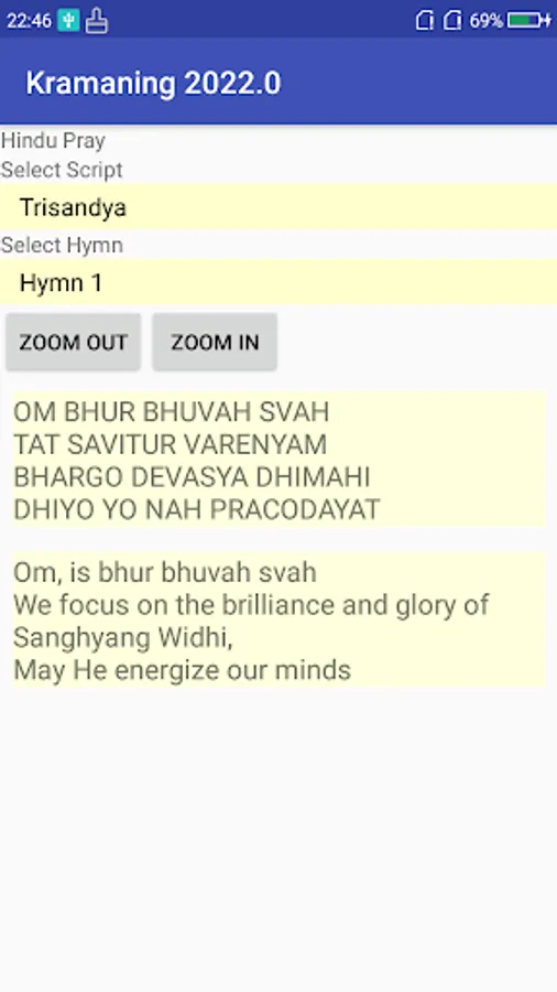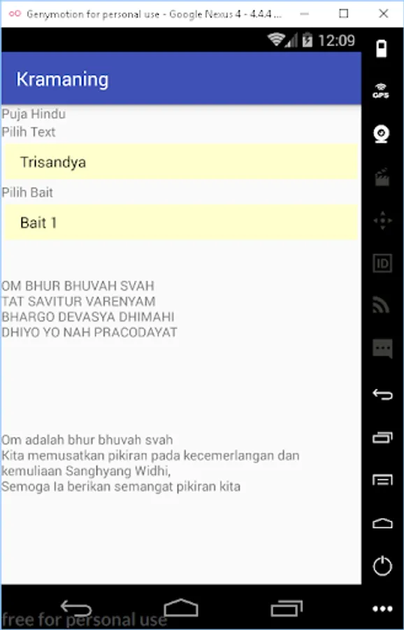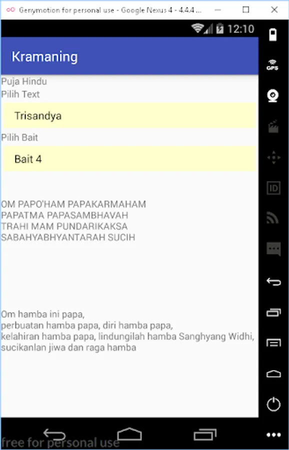 This application contains text Trisandya and Panca Sembah. Text Trisandya and Panca Sembah are prayers that are said by Hindus in Indonesia, whether they are done in temples, at home or in other places whenever possible.