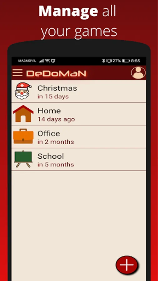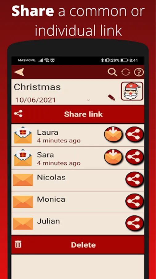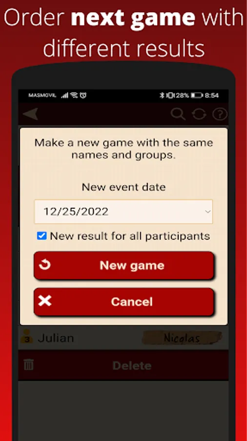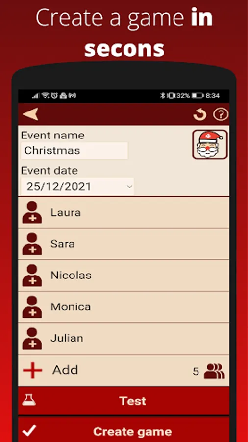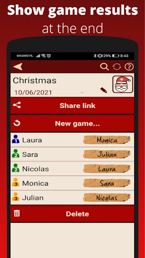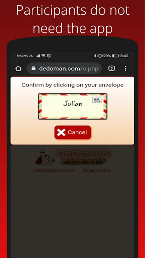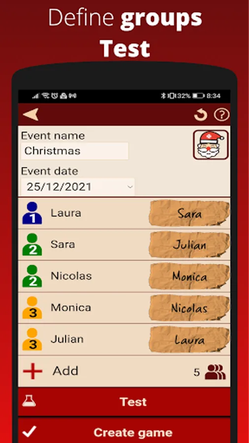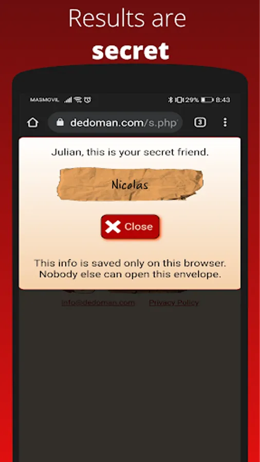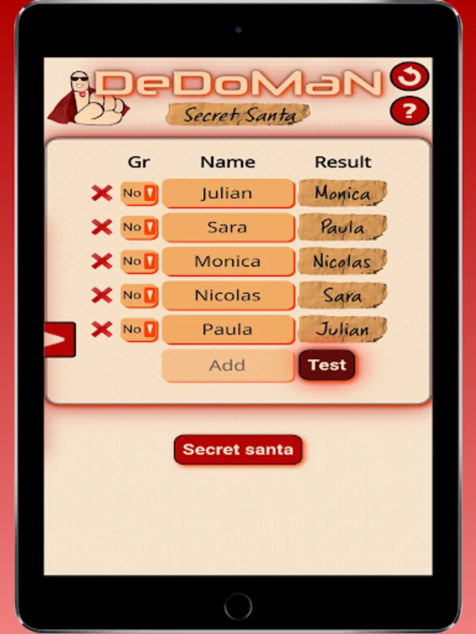 Introduce a list of names and let Dedoman relate them randomly. You can assign groups to candidates so people who belongs to the same group or "team" won't be assigned. This is useful when for example you are a group with several families and you don't want members of the same family buying between themselves.