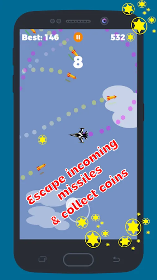 Simply aviate and steer your aircraft, only with your thumb, aim to collect stars and get most advanced fast planes. All you need is more speed and manoeuvrability. It is a missile dodge game so you should avoid homing missiles.