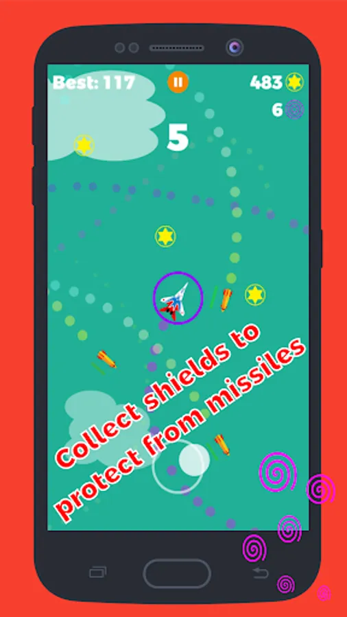 If you collide missiles game ends. You can get another faster and manoeuvrable planes with the points you collected. Shields helps survival, for a limited time and in this period missile explodes if they hit your plane`s shield. Get more shields to extend survival time.