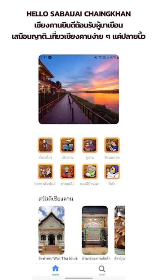 Chiang Khan welcomes visitors like relatives...Traveling to Chiang Khan is easy at your fingertips with services from Sabaijai ChaingKhan Application (various travel styles). middle way and destination and tourism in Chiang Khan Ready for you to travel with confidence. to safety with a variety of travel channels The origin is traveling by airline. Public transport to Chiang Khan In the middle of the road when arriving at the province of Loei And the destination in Chiang Khan, call a car for tours, cycling, where can you call a car, for example, a fair fare that meets all travel needs in one app We connect contact with the driver team. To meet all your needs in terms of travel and fares. Including travel services for Chiang Khan and nearby attractions