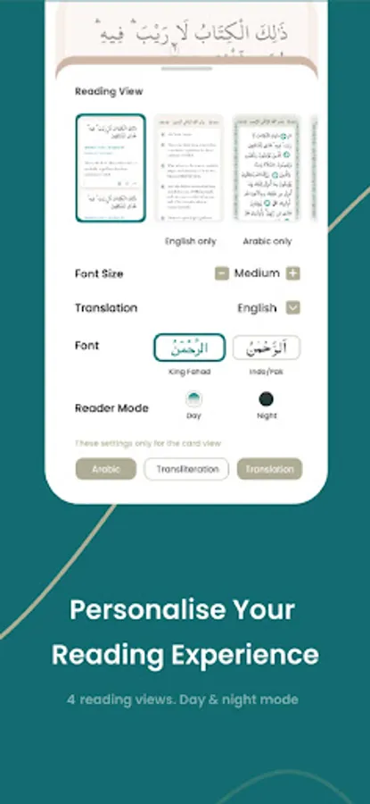 - Read the Quran in Arabic only mode or with translation and transliteration.