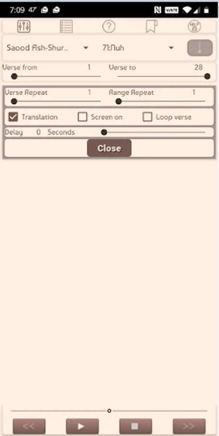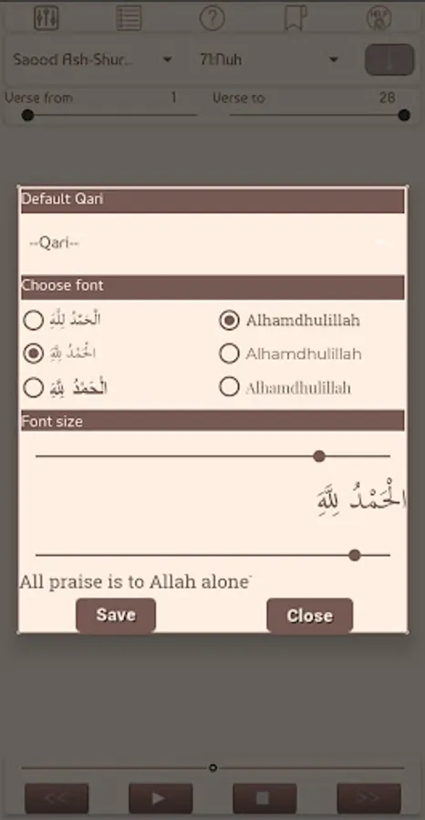* Bookmark specific selection (Qari, surah, repetition range). Handy to quickly load from the bookmark instead of selection each time.