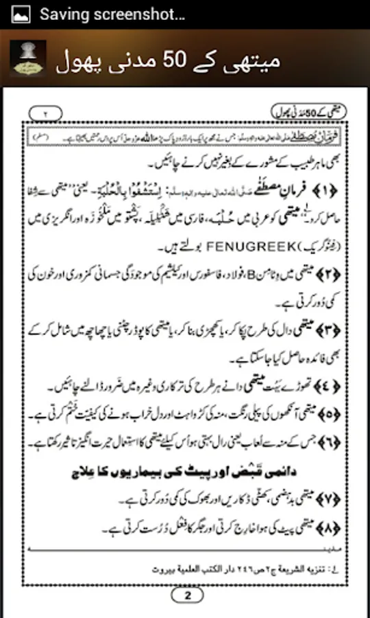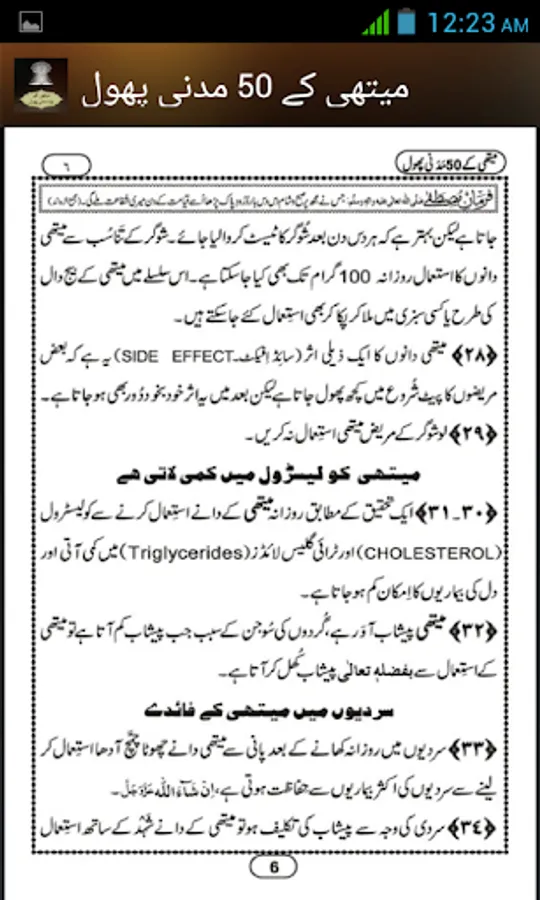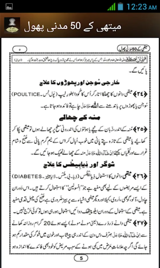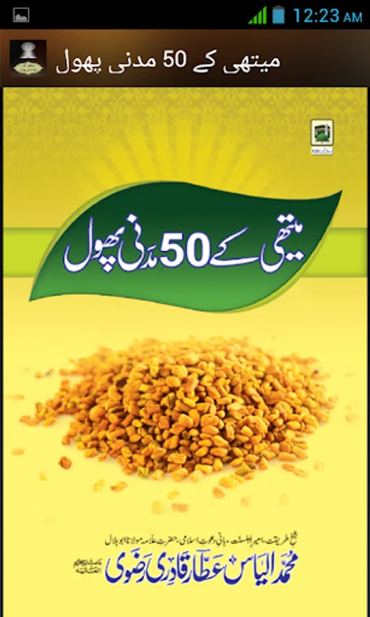 Methi k 50 Madani Phool in Urdu is an Islamic App for Muslim brother and sisters. This app is based on Book "Methi k 50 Madani Phool" written by DawateIslami Founder Sheikh e Tariqat Ameer e Ahle Sunnat Hazrat Allama Molana Abu Bilal Muhammad Ilyas Qadri Razavi.. This Booklet Includes Superb Knowledge Of Topics Like Cure of stomach diseases and chronic constipation,Treatment of haemorrhoids/piles,Mouth ulcer,Madani pearls about fenugreek Qahwa,Gutka addict cured! (Parable),A parable about divine Barakah in bike’s fuel And Many More