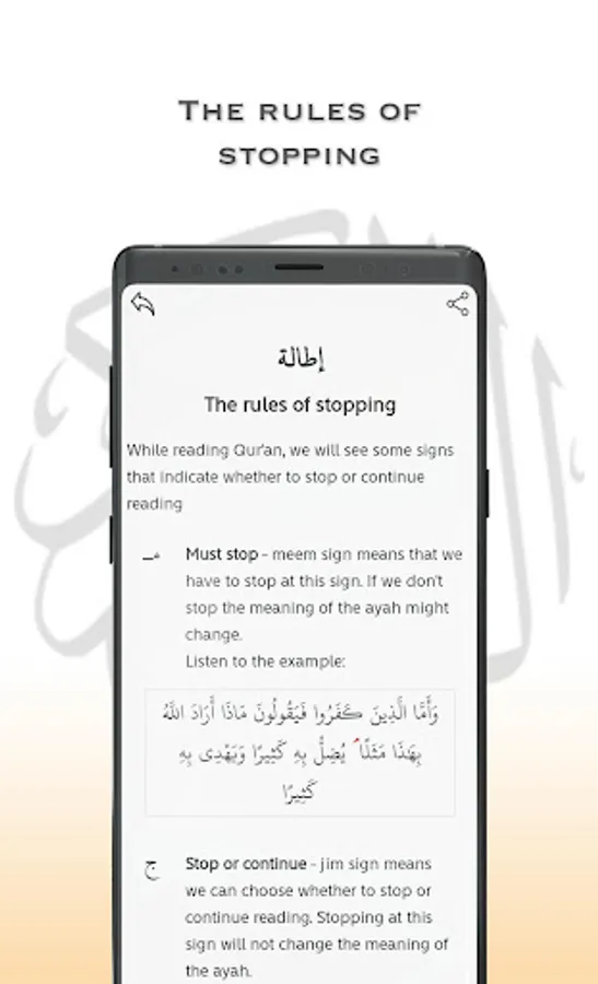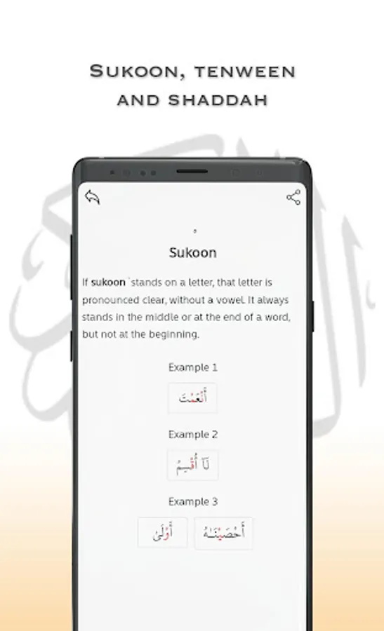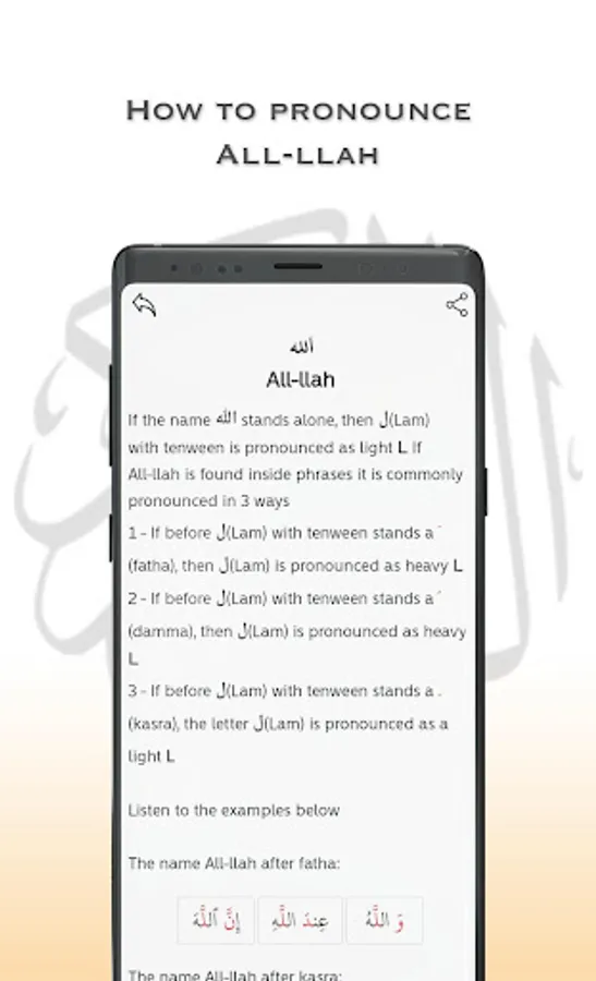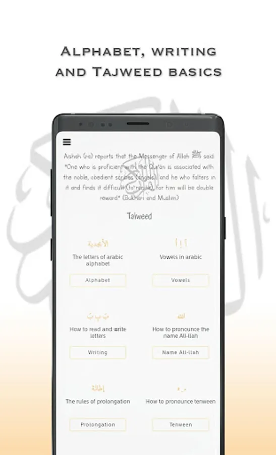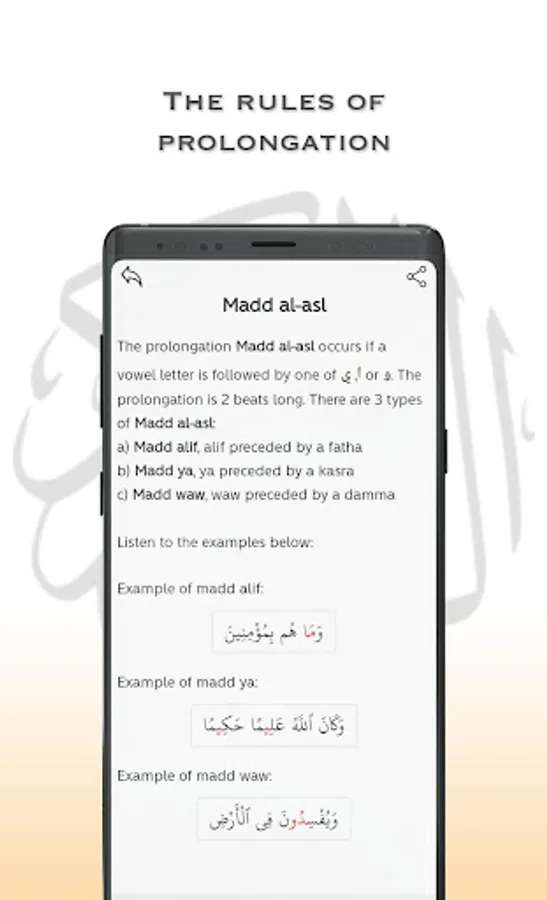 All topics included in the application are illustrated with written examples and audio form well-known reciters: