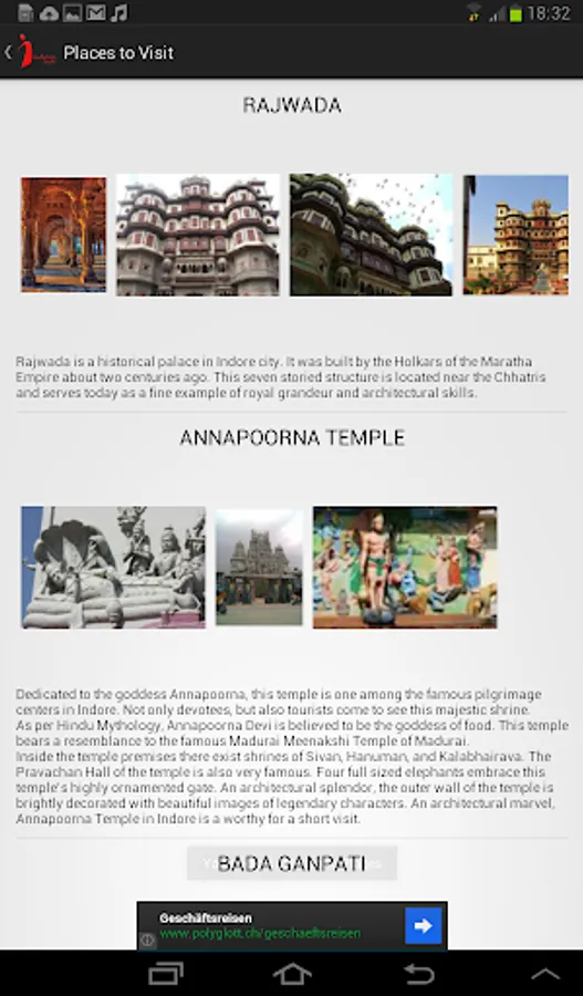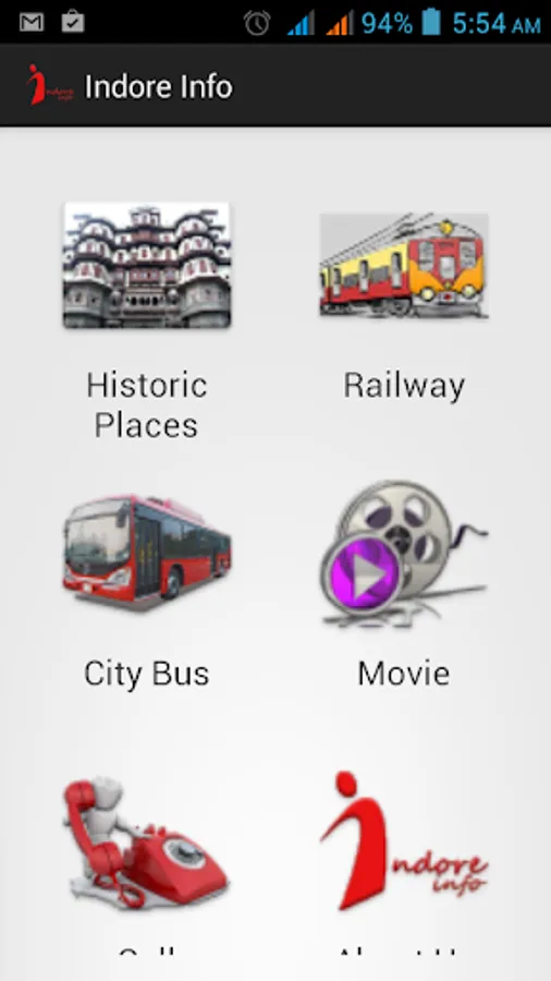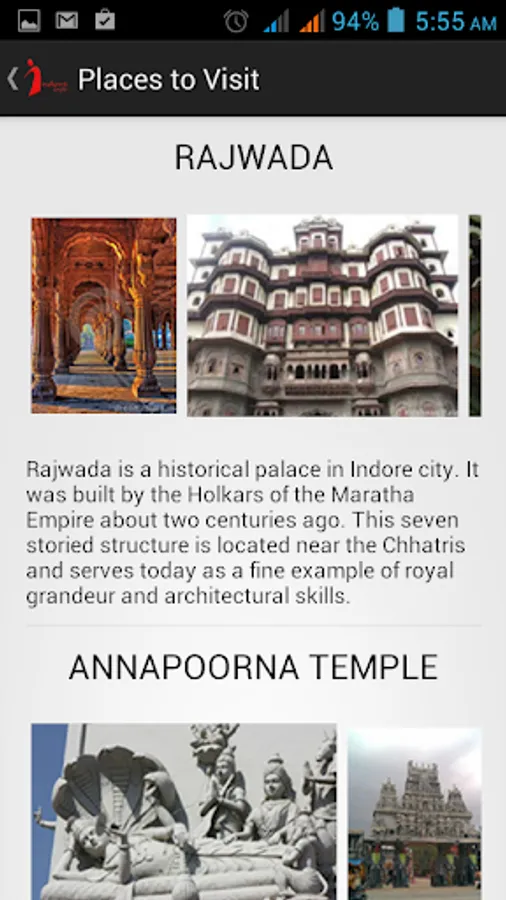 Application include some must visit place of Indore, their sort description and few images other than this it covers information about city transport, railway, movies and we are trying to add more and more information about indore....