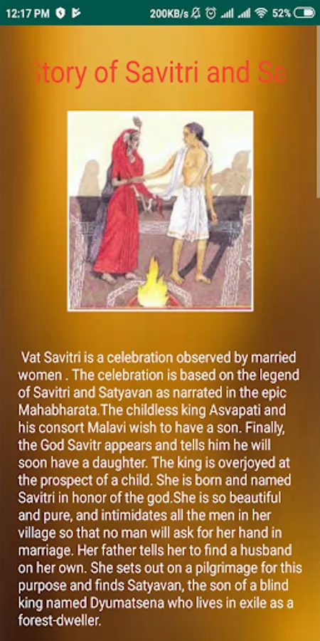 Vat Savitri is a celebration observed by married women. The celebration is based on the legend of Savitri and Satyavan as narrated in the epic Mahabharata. The Childless king Asvapati and his consort Malavi wish to have a son. finally the God Savitri appears and tells him he will soom have a daughter. The King is ob=verjoyed at prospect of a child. She is born and named Savitri in honor of the God. She is so Beautiful and pure, and Imidiates all the men in her village so that no men will ask for her hand in marriage. Her father tells her to find a husband on her own. she sets out a pilgrimage for this purpose and finds Satyavan, the son of a blind king named Dyumatsena who lives in exile as a forest-dweller.
