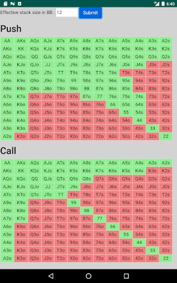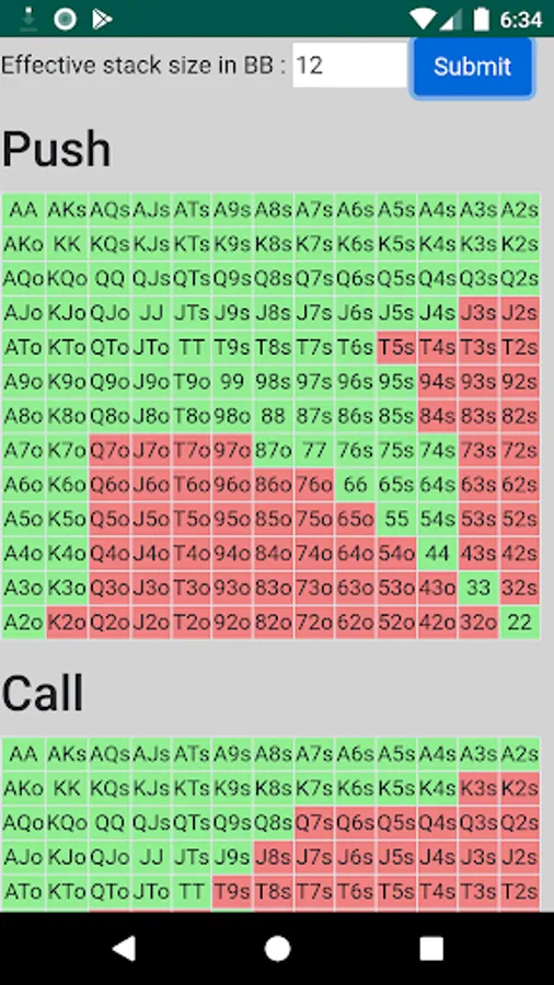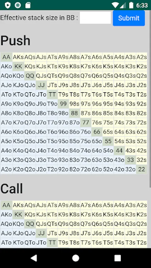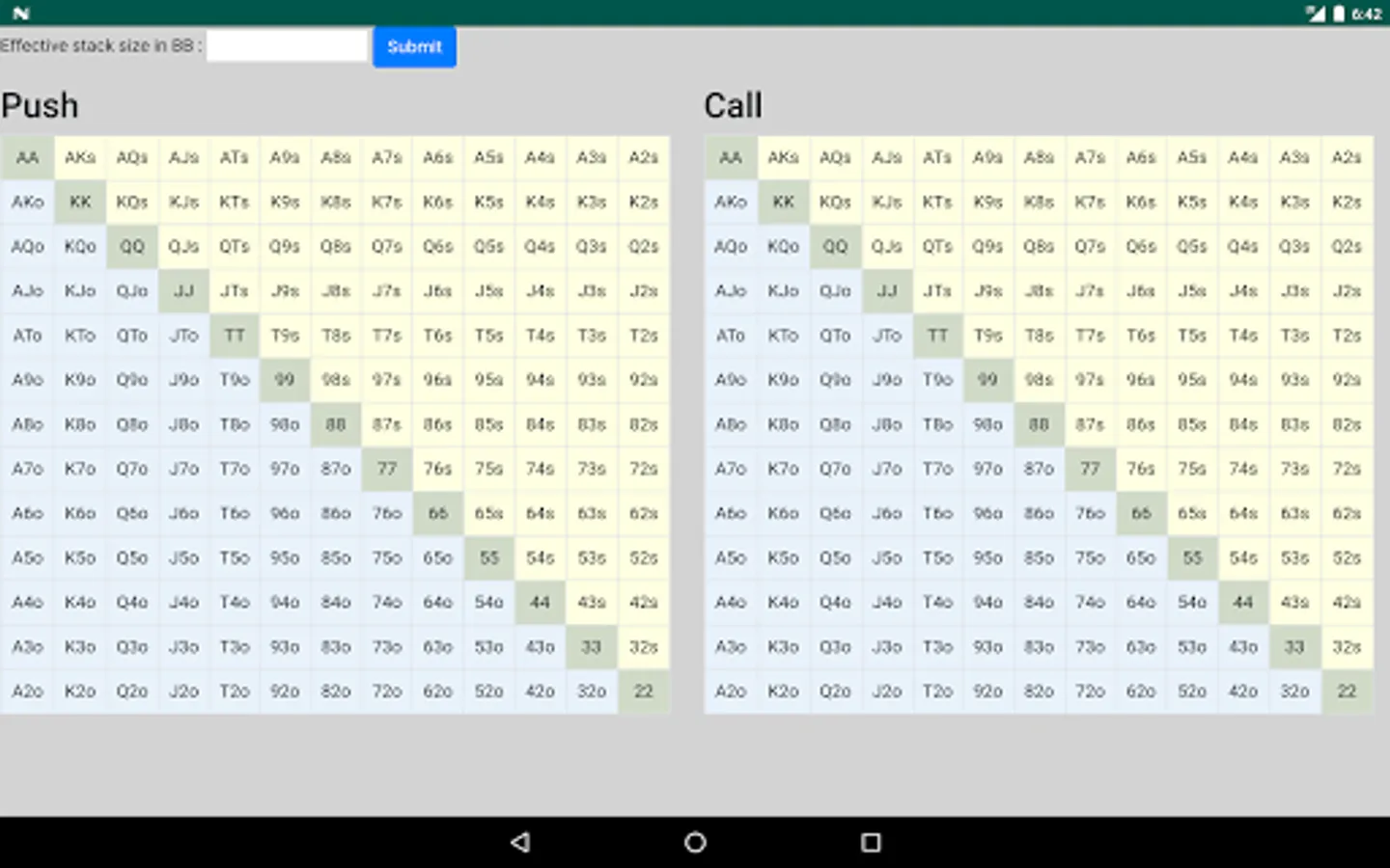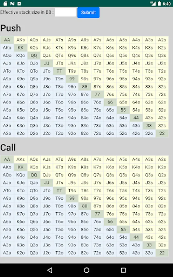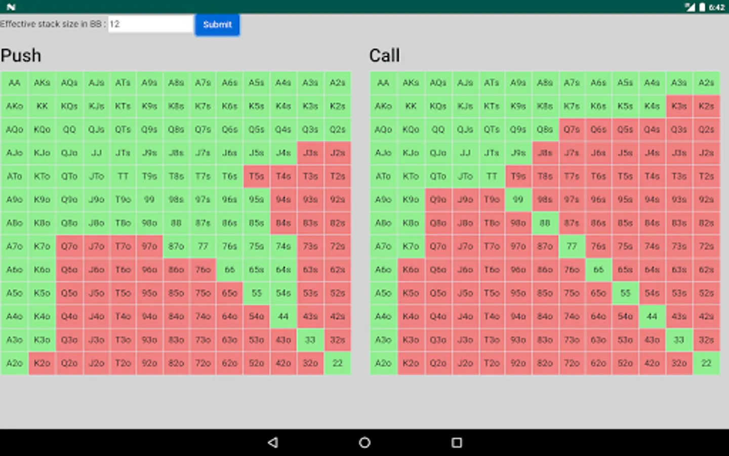 You just need to indicate the effective stack size and validate to see which hands you have to "Push" and which ones you need to "Call".