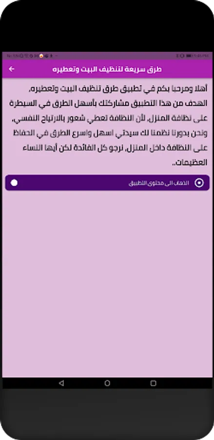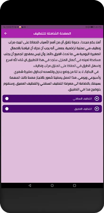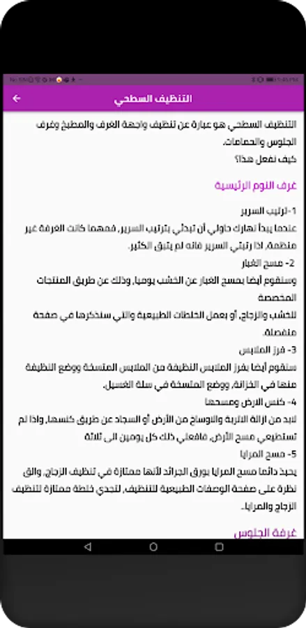 ستجد في هذا التطبيق اسهل واسرع الطرق في تنظيف المنزل وتعطيره, حيث قمنا بتقسيم المهام الكبيرة الى عدة مهام صغيرة حتى لا يضيع اليوم كله في الترتيب والتنظيف, وقمنا بتقسيم العمل الى التنظيف السطحي والتنظيف العميق, وستجد في تطبيق اسهل واسرع الطرق في تنظيف المنزل وتعطيره تغطية كاملة لتنظيف: