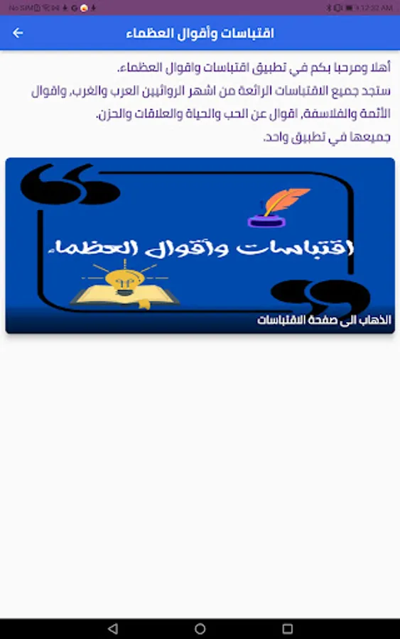 اهلا بك في تطبيق اقتباسات واقوال العظماء, لقد وضعنا في هذا التطبيق اغلب الاقتباسات الرائغعة والأقوال للفلاسفة والروائيين المؤثرين في العالم.