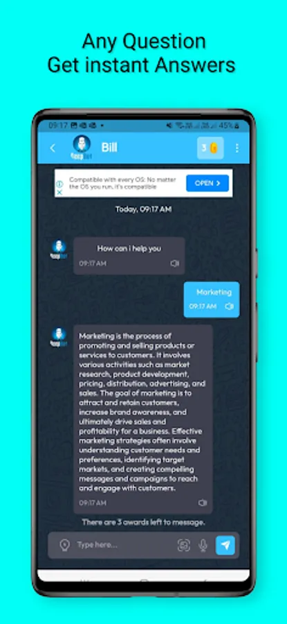 Experience an extensive realm of data, automation, and knowledge with the AI Helper Chat Bot for Android powered by DeepBot . Our bot chat utilizes OpenAI’s ChatGPT & GPT-4 technology to answer any requests you might have. Be it a professional marketing email, an educational question or writing tasks. Our AI Assistant Chatbot powered by OpenAI's Chat GPT & GPT-4 is capable of answering any question.