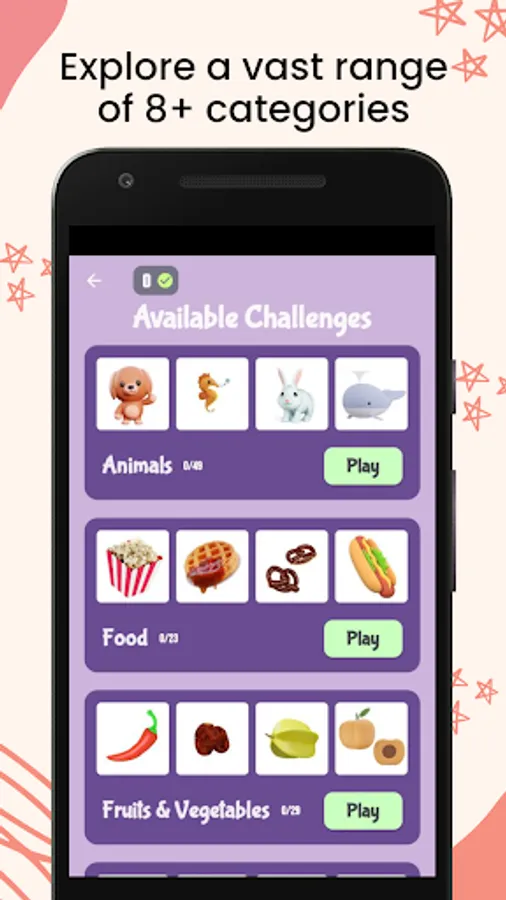 When you're ready to embark on a knowledge-packed journey, launch the 📘 GK quiz for kids app. Press 'Play' 🎮, and dive into the world of kids trivia 🎉. Navigate through our comprehensive categories 🌐, from guessing an animal's visage to discerning country flags, or even diving deep into sports items and fruits & veggies 🍇🏏 through our well-crafted quiz questions. With multiple formats from MCQs, full answers, to fill-in-the-blanks, it's the ultimate kids GK quiz experience!