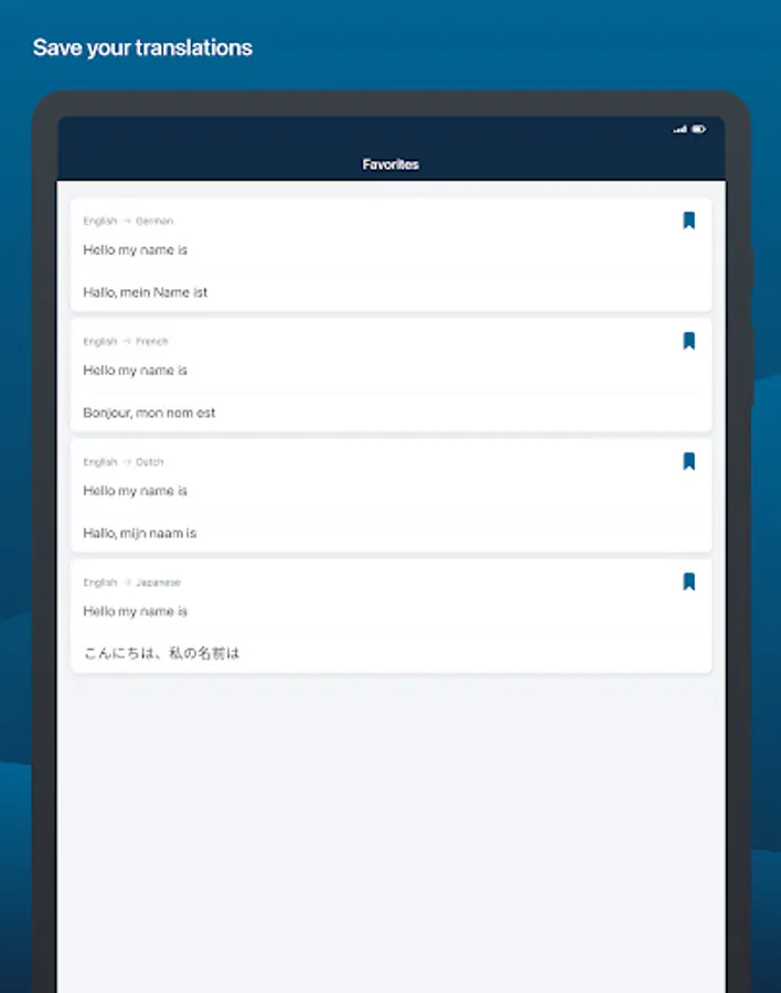 * Saved translations: Tap the bookmark icon and save words and phrases for future reference or to build your own vocabulary (all languages)