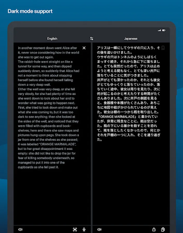 * Dark mode: Protect your eyes from bright light and save your battery life while translating