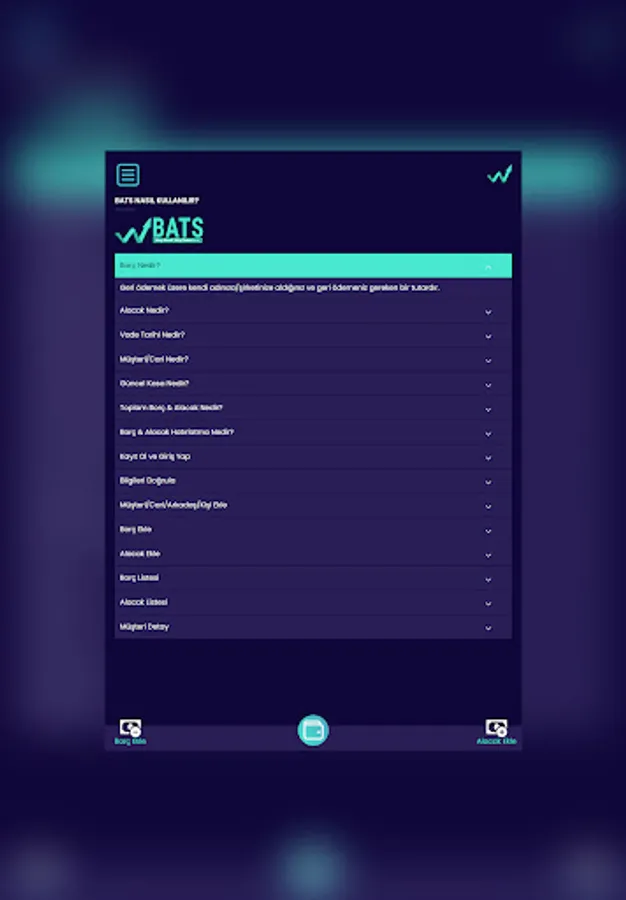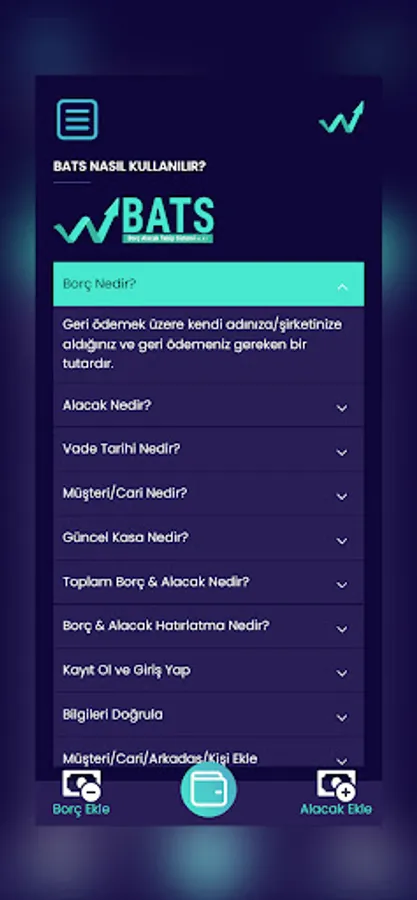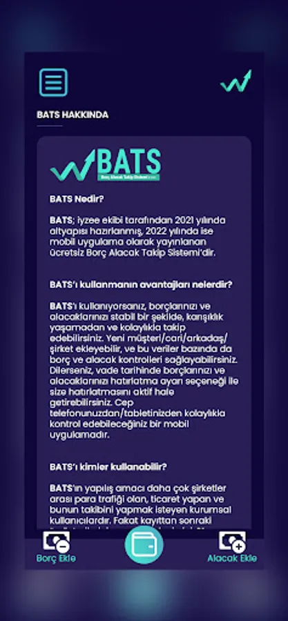 If you use BATS, you can track your debts and receivables stably, without confusion and easily. You can add new customers/current/friends/companies, and provide debit and credit controls based on these data. If you wish, you can activate it to remind you with the option of reminding your debts and receivables on the due date. It is a mobile application that you can easily control from your mobile phone/tablet.