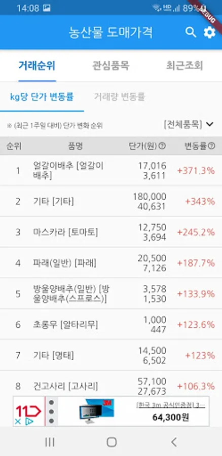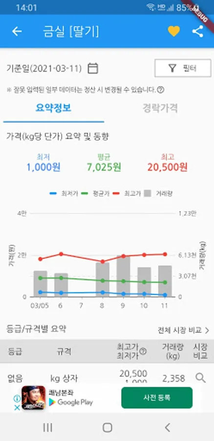 -Provides information on the minimum/average/maximum unit price per kg of the desired auction day and the flow of the latest unit price/transaction volume in a graph.