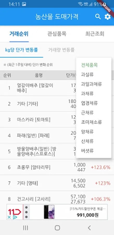 -You can also check the ranking of major items by classification (fruits, fruits and vegetables, fruit vegetables, leafy vegetables, root vegetables, seasoned vegetables, western vegetables, wild vegetables, mushrooms).