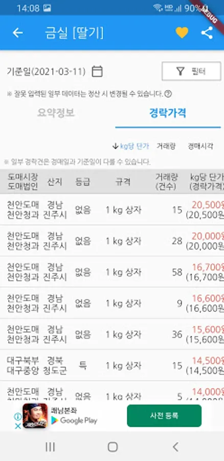 -You can find the wholesale market/wholesale corporation, production area, grade, standard, volume (number of cases), unit price per kg, meridian price, and auction time of meridians.