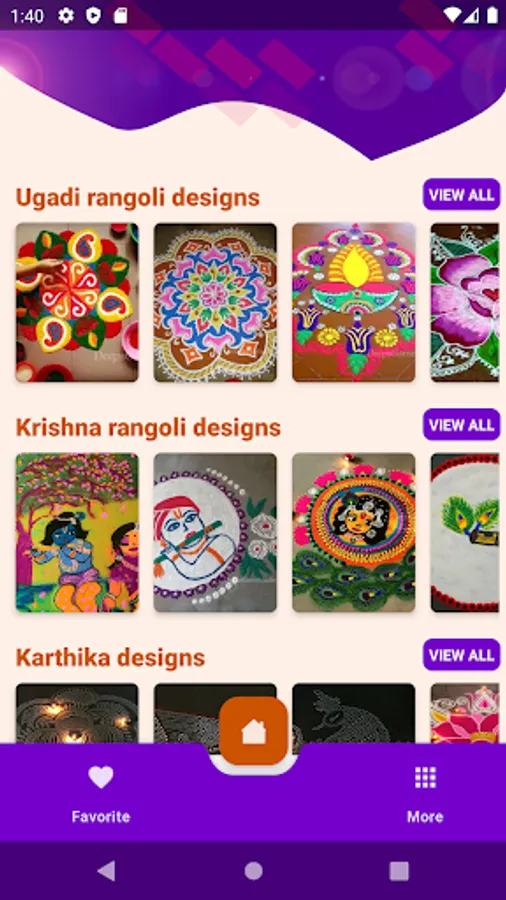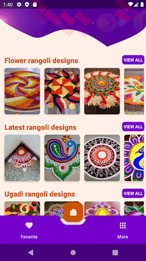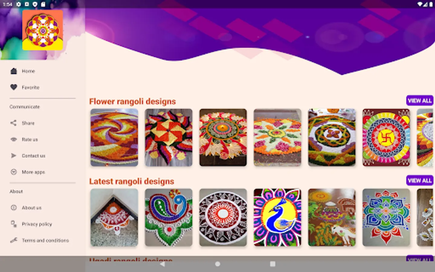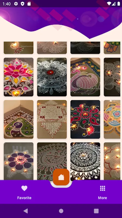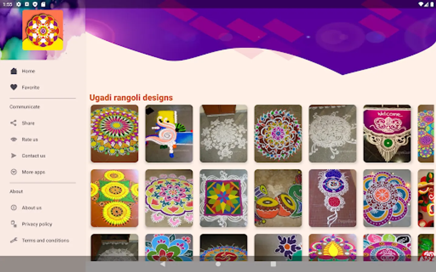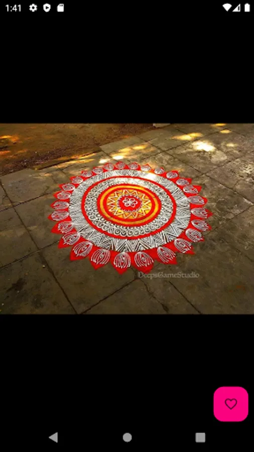 Rangoli is an art form from India in which patterns are created on the floor in living rooms or courtyards using materials such as colored rice, dry flour, colored sand or flower petals. It is usually made during Diwali (Deepawali), Onam, Pongal and other Indian festivals.