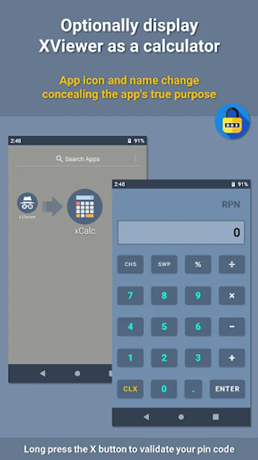▪ App can be optionally shown as a fully functional calculator: the launcher icon for xViewer changes to a calculator icon and the calculator doubles as pincode keypad; once the calculator is on-screen just long press the X button to either switch to biometrics or to validate your pincode