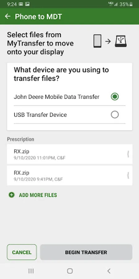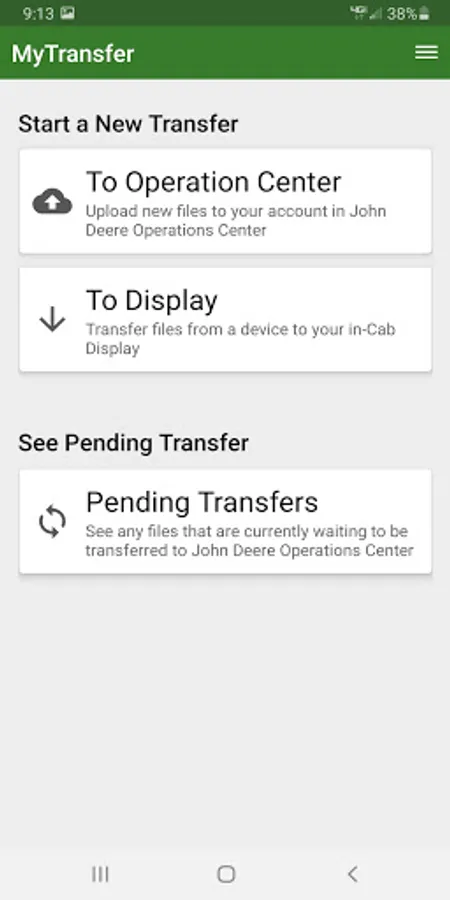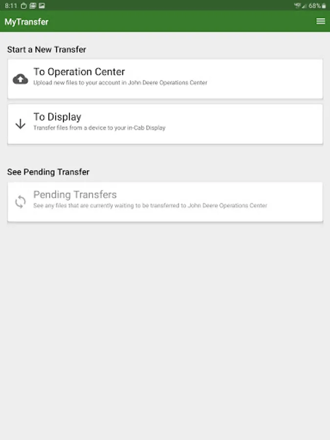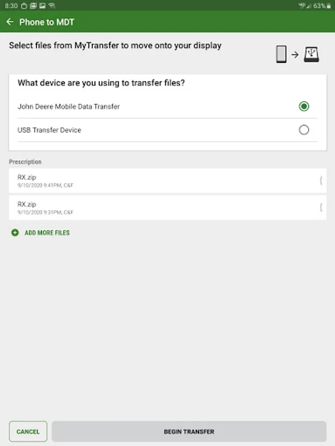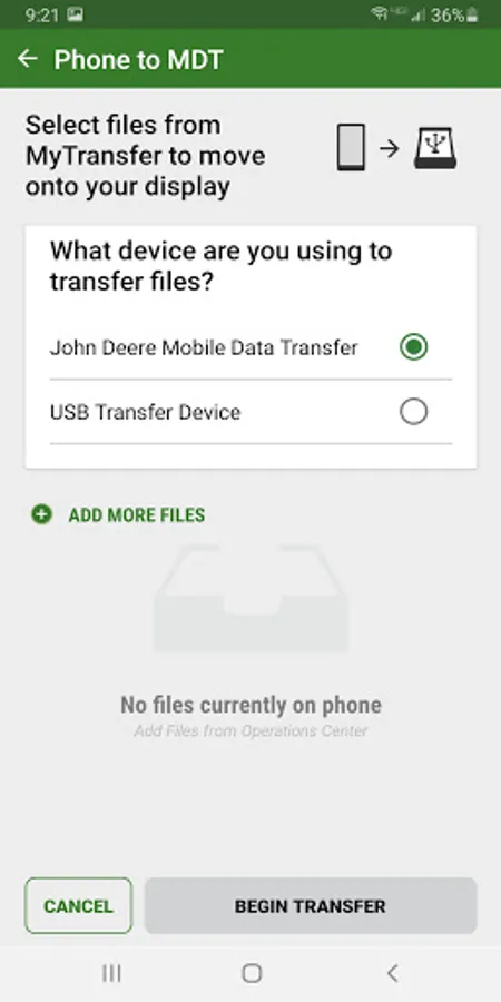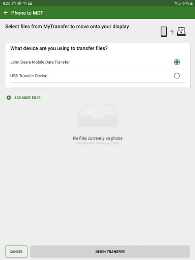 John Deere utilizes a USB device and the MyTransfer mobile app to export files from an in-cab display, then sends those files directly to the Operations Center using a smartphone. Additionally, setup and prescription files can be pulled from the My Files section of the Operations Center account while in a machine in the field.
