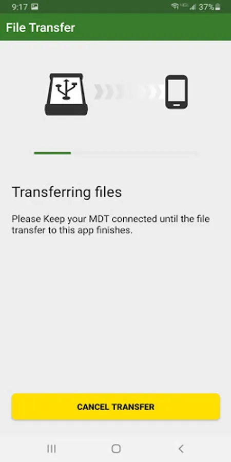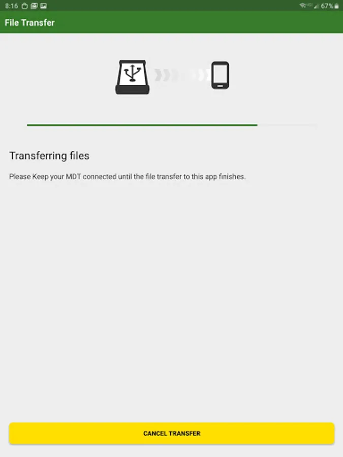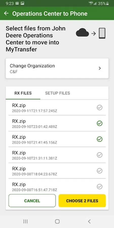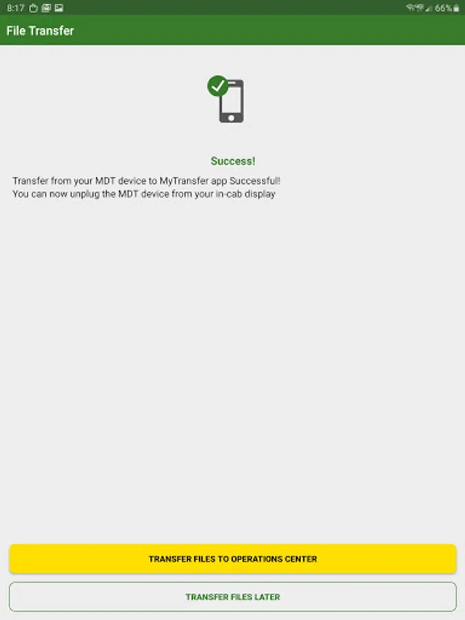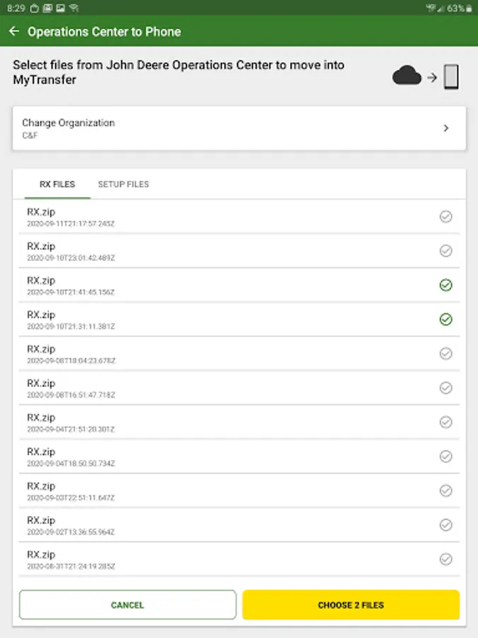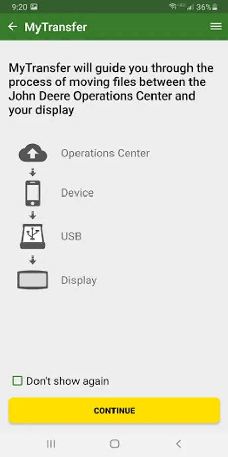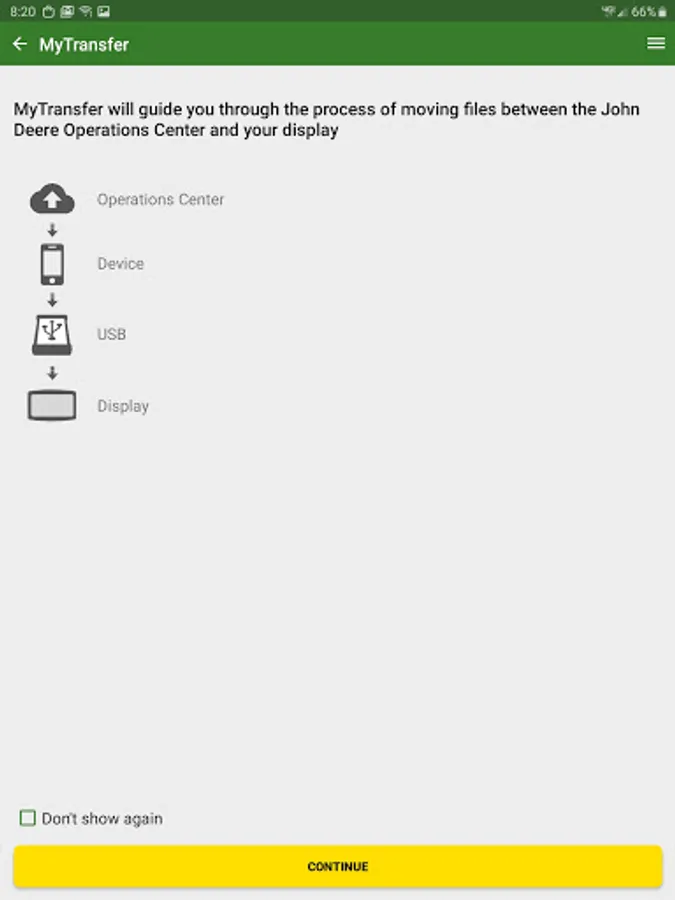 John Deere utilizes a USB device and the MyTransfer mobile app to export files from an in-cab display, then sends those files directly to the Operations Center using a smartphone. Additionally, setup and prescription files can be pulled from the My Files section of the Operations Center account while in a machine in the field.