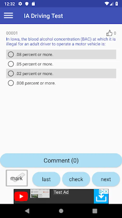 You must pass a written test, consisting of 35 multiple-choice questions, to receive either your learner’s permit or driver’s license in the state of Iowa. If you are attempting to get your learner’s permit, you will need to be at least 14 years of age, pass the written test, provide appropriate identification and proof of state residency, and provide proof of parental permission. At the age of 16, you may then move up to a provisional license. If you are attempting to get a regular driver’s license, non-provisional, you will need to be over the age of 18, pass written and vision tests, pass a driving skills test, and provide proof of identity and state residency. The questions on the written test are based on Iowa’s driving rules and laws as laid out in the 2022 Iowa DOT Driver’s Manual. The fee for a learner’s permit is $6 and it is valid for four years. The fee for a driver’s license varies based on the age of the driver. A minor’s restricted license is $8, while a regular license is $4 per year. This Iowa DOT practice test app covers the same information as the real written test.