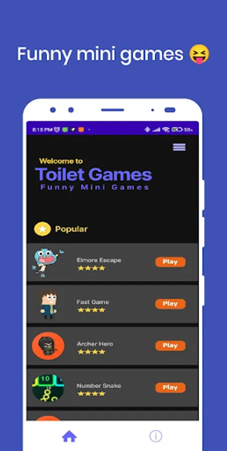 Collection of games, action, sports, cards.that you can play it when you are in the bathroom.