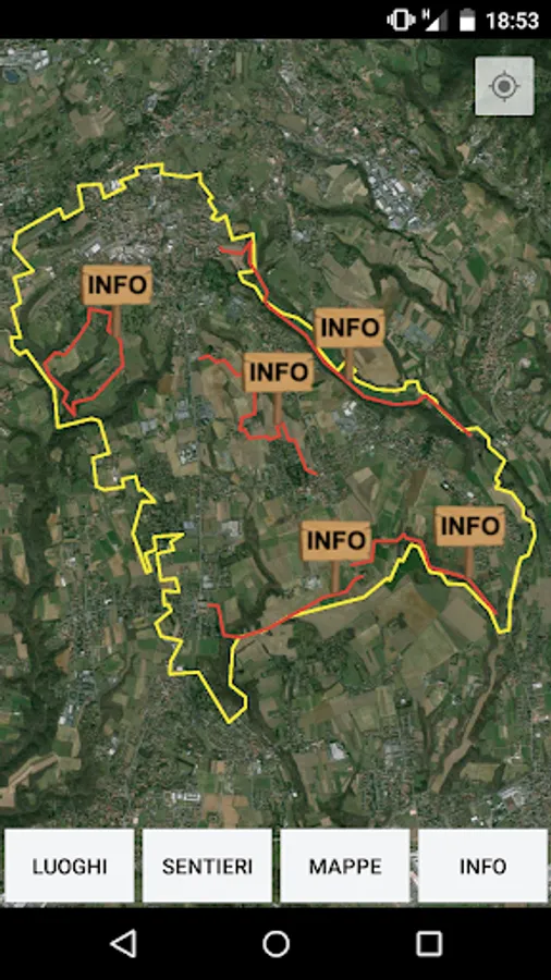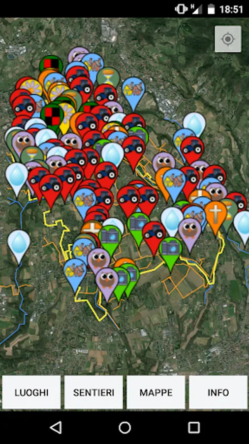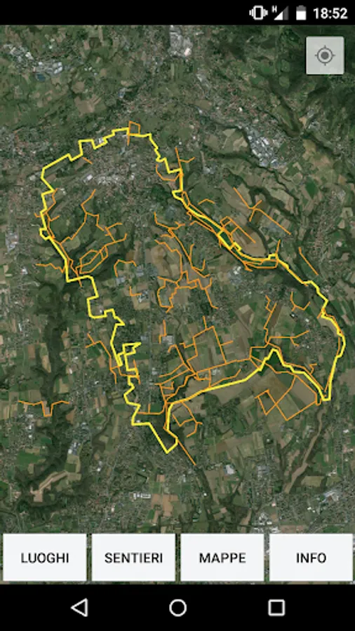 The app shows a map of the town of casatenovo with their paths. Geo-location also allows you to accurately determine your location. Among the functions you can activate and deactivate the display of the main places of interest of the country. They have marked out the main paths through the territory of Casatenovo; for each of these they are highlighted km and the travel time.