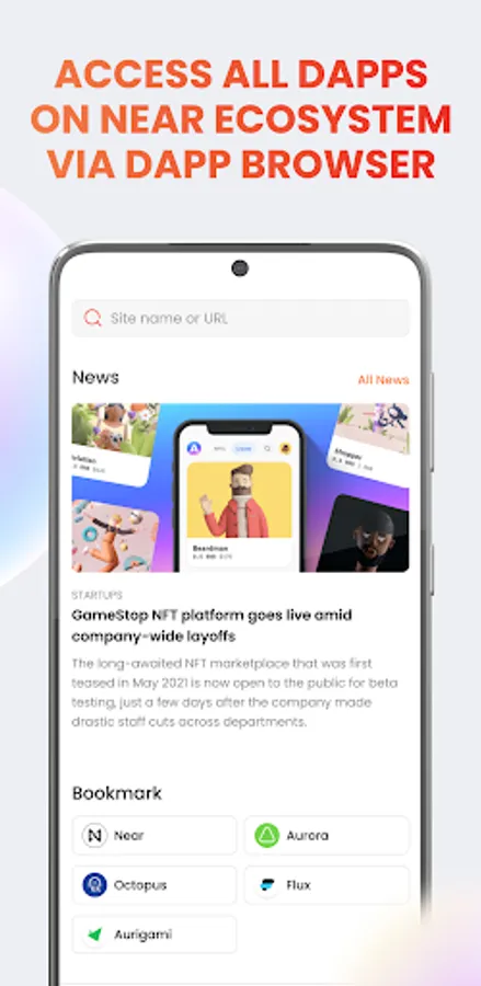 - Browser: Access any DApps built on Near Ecosystem with our mobile browser natively built in our NearFi mobile application. Major DApps such as Ref finance, Burrow, MetaPool and many more applications are supported. This way you can participate in DeFi on Near ecosystem on the go.