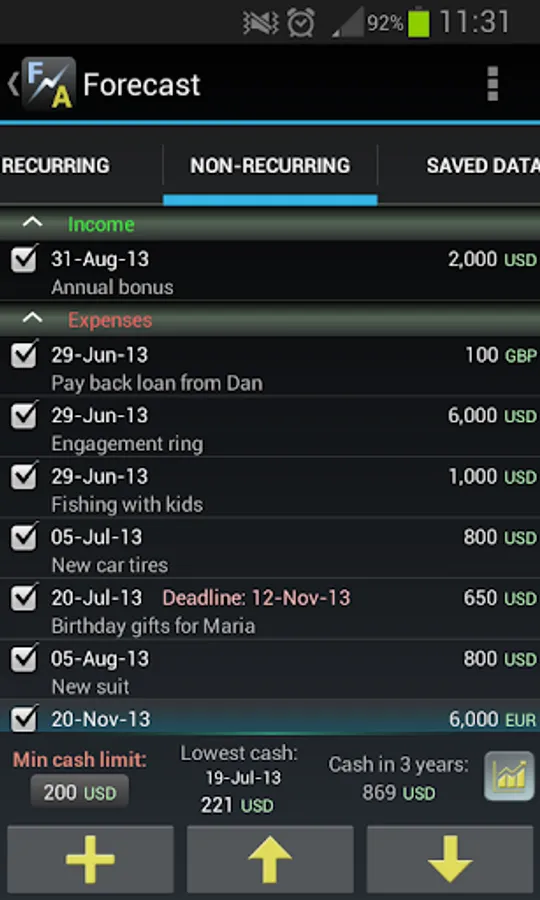 Simply set the list of big purchases you need or are considering to buy and FINANCIAL ADVISOR will instantly give you the dates when you have enough cash for it without risking getting into debt or damaging savings.