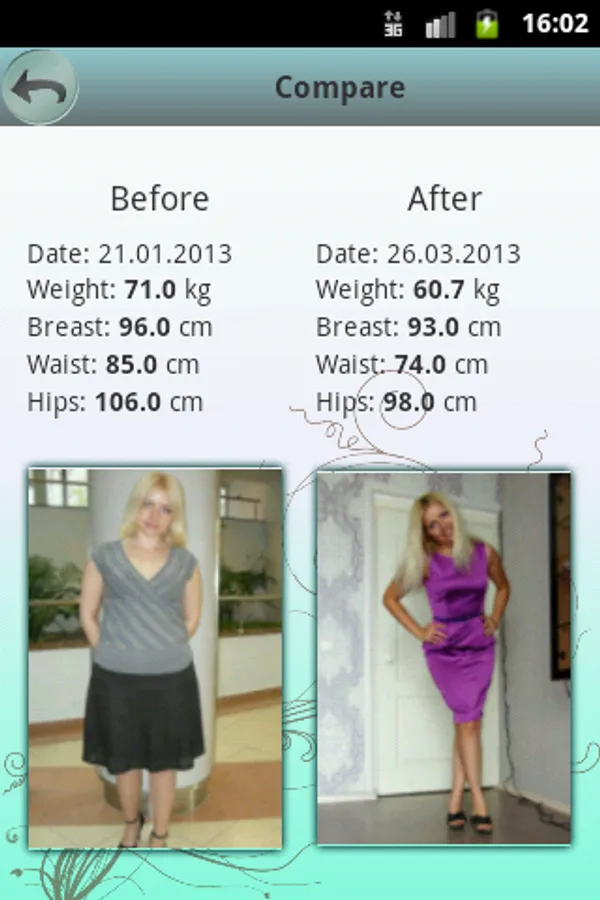 Let the SlimPlan become your journal to keep a story of your great victory over yourself. The comparison functionality will show you real changes of your body over the course of a diet/training. All your data is password-protected: upload your pictures to the gallery without worrying that someone else could see them.