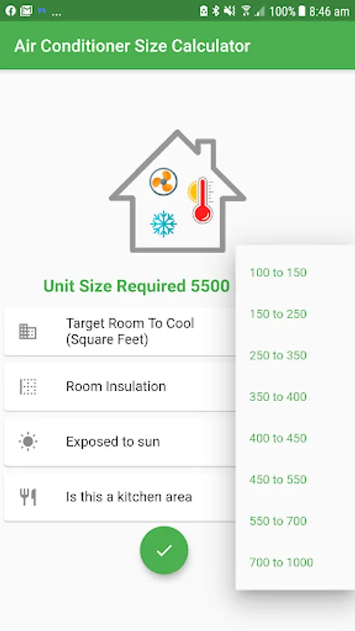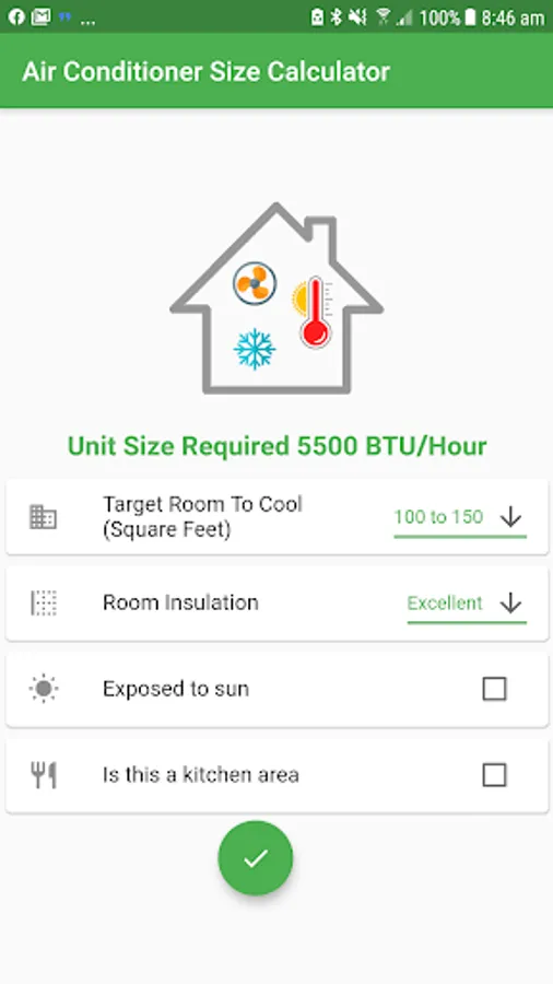 This calculator is designed to give an approximate size for an adequate room air conditioner unit capable of cooling the room you have described in your entry. Select entries from the drop data boxes for the room size and amount of room insulation. Select yes or no values for DIRECT sun exposure and if the room is a kitchen. Morning sun exposure is not usually a problem, however afternoon sun exposure often adds up to 15 degrees to a room. Our selection of a kitchen is based on added heat potential to a room. You may wish to try both selection if you are in question to see if there is a change in the suggested cooling required. If you are on the borderline of two potential units and there is no major price difference, we suggest the larger cooling capacity.