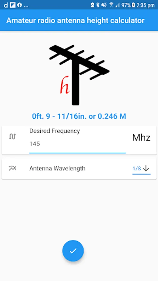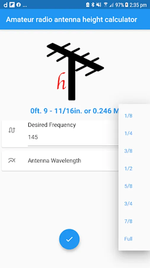 The calculator app is designed to give the vertical height of a particular antenna, for the frequency and wavelength chosen. This does NOT take into consideration the type or size of horizontal reflectors, of even if there is a need for them. Enter the desired frequency and select the wavelength. Click on Calculate and the optimum length for that combination will be displayed in feet,inches and fractions of inches, and in meters. To optimize the antenna for a frequency RANGE, do the calculations twice, once for the low end of the range and once for the high end; then average the two and plan to adjust the VSWR on both ends of the range as needed.