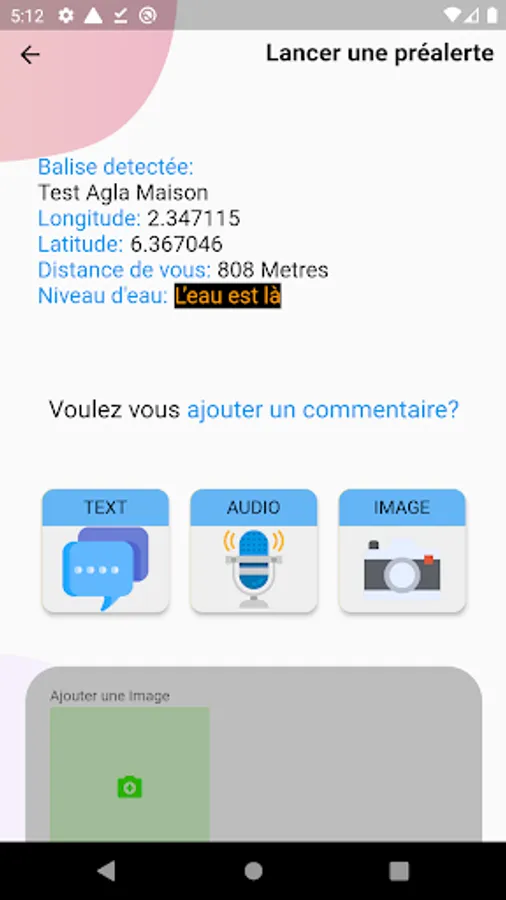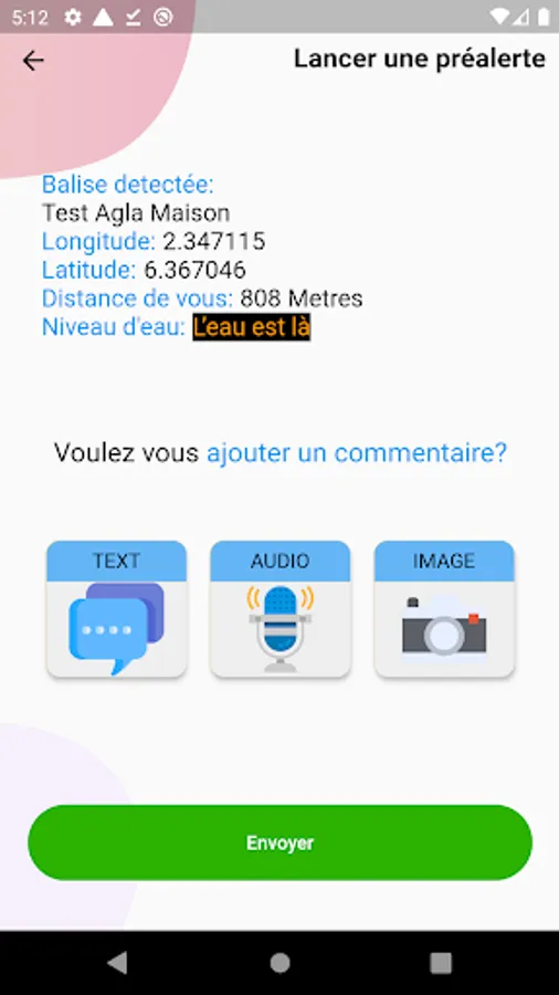 ✓ Sends a message on the water level observed in the locality concerned by pressing the color of the corresponding tag followed by a brief but not mandatory comment which can be in the form of a text or an audio or a photo;