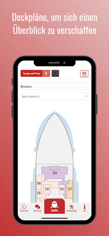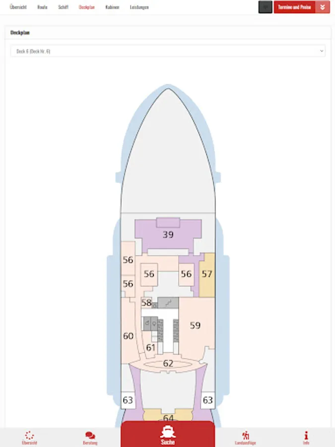All important details about the offered cruises: deck plans, cabins, route and ship details.