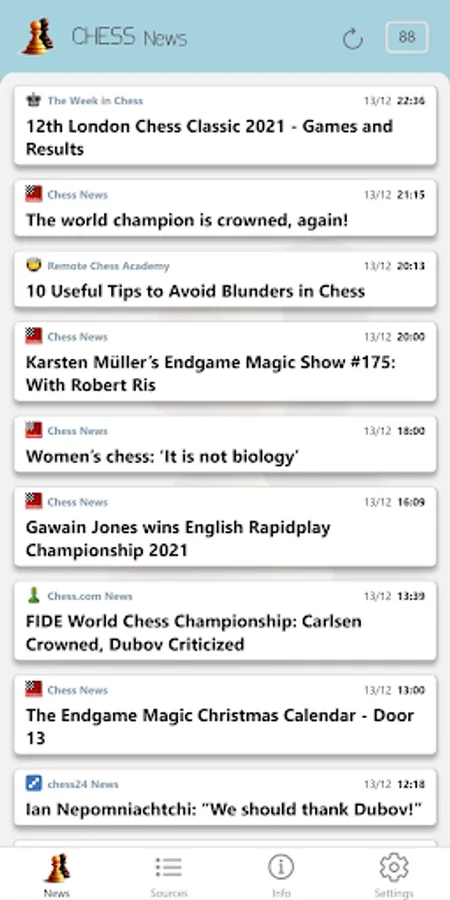 Chess news articles are aggregated from: