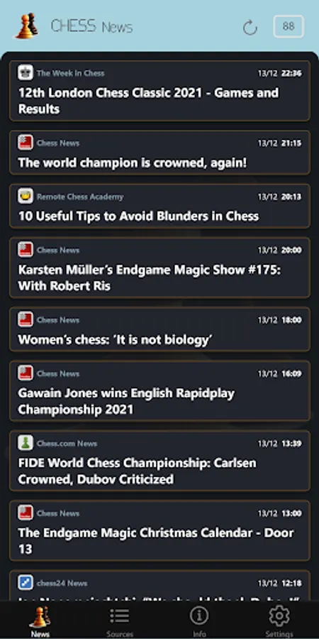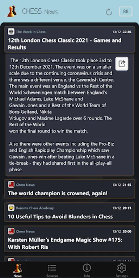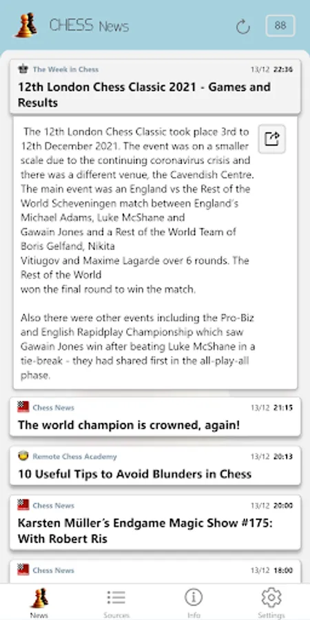 The app is collecting news from various chess news portals. Displayed news are up to 7 days old.