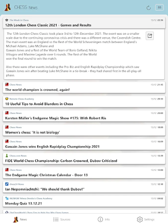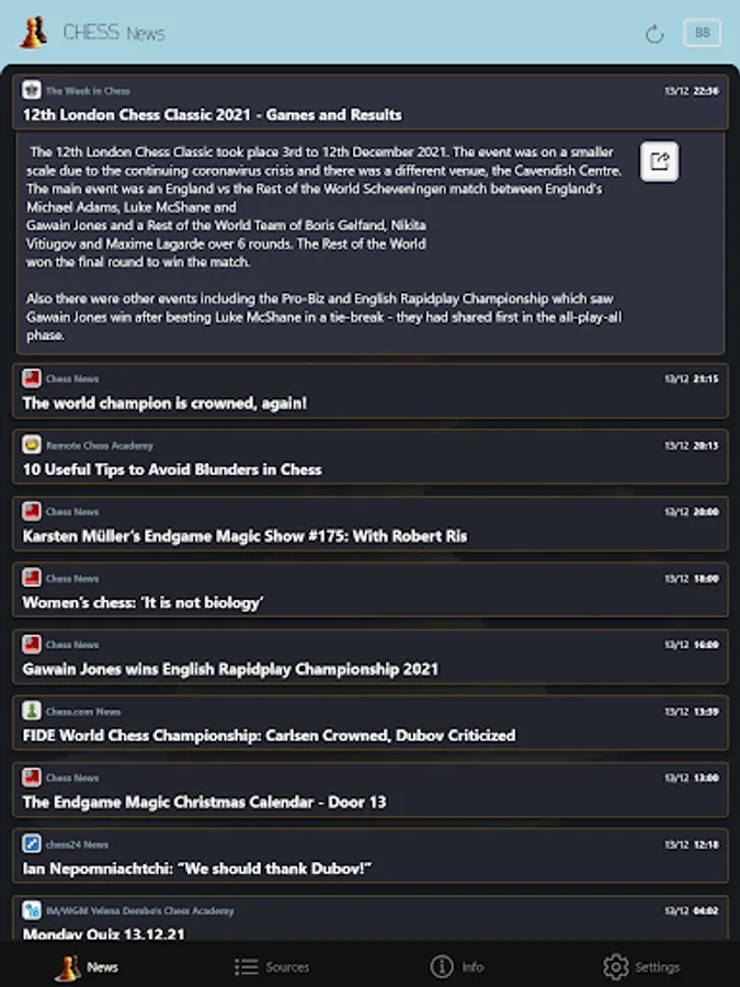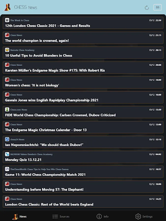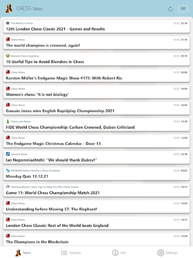 All the articles in the application are chosen and set by the portals from the sources list. ChessNews is not the author nor the owner of articles' titles and descriptions. Source is clearly stated for every article. Complete original article can be read by opening the link in the upper right corner of the description. Displayed date and time represent the date and time when original article is created.