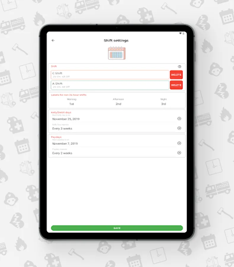This is where Fire Shift Calendar (FSC) comes in. Simply input your shift pattern, e.g. 24 hours on, 48 hours off, and it automatically populates for you. Even if your shift is a split/partial one like 8 or 12 hours, a full day, or multiple days, this calendar makes it easy to keep track of even the most complexed schedules.
