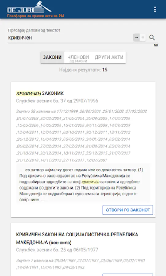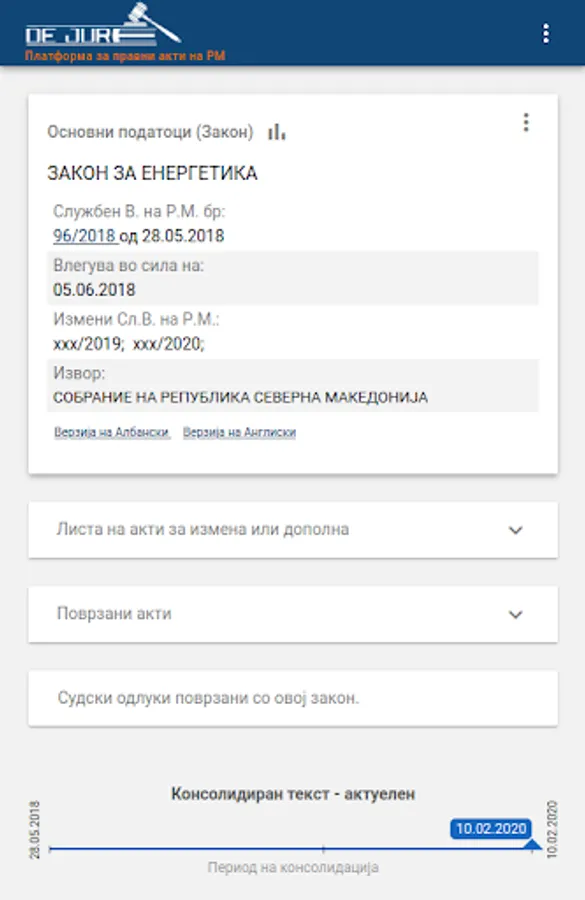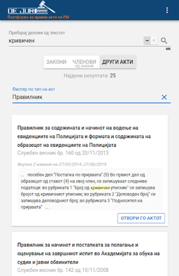 dejure.mk is a digital platform made with the most modern web technologies on the cloud, which processes and connects the legal acts published in the official gazette with the case law. The platform dejure mk has processed all legal acts and has related them to over 380,000 court decisions from the last 7 years. The connection between acts and judgments is at the level of a member of the acts, which means that it is possible to find which article in which judgments are mentioned.