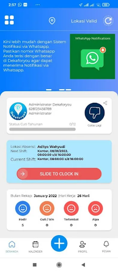 10. Push & WA Notification: Seluruh aktivitas absensi hingga proses approval dapat terpantau melalui notifikasi realtime.
