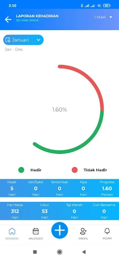 11. Comprehensive Reporting: Karyawan dan HR dapat melihat laporan kehadiran secara lengkap, disertai dengan jumlah jam kerja hingga 1 tahun.