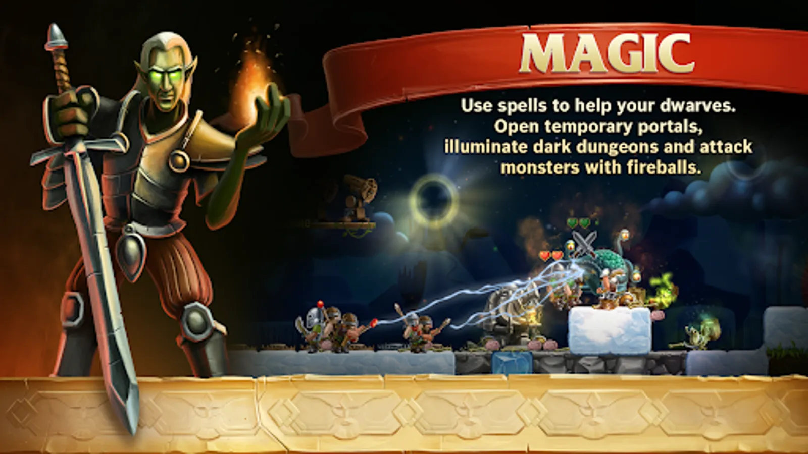 As a divine being, you possess various spells. You can speed up the movement of the dwarves, open small portals, illuminate dark caves to scare away monsters, evoke natural magic in the form of rain or tree growth, hurl fireballs at the monsters’ heads, and find useful resources and hidden rooms underground, thereby helping to speed up resource extraction, exploration of the world, and the population growth of your assistants.