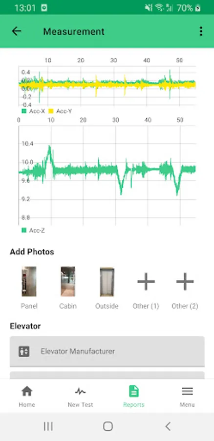 The smartphone will use its sensors to record acceleration, audio, door movements and send it to the evaluation server, which performs the extensive analysis to create all assessments of your elevator.